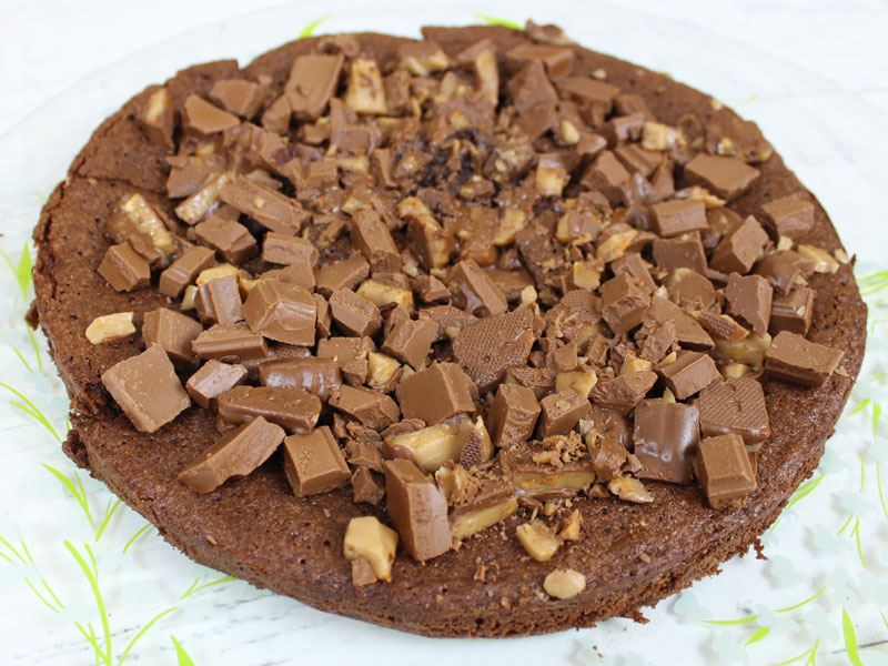 Melt butter and set aside to cool a bit. In a medium bowl whisk eggs, sugar and vanilla together until smooth and light colored. Whisk in the melted butter in two additions. Sift the cocoa, flour and salt into the egg mixture and fold gently to just combine. Transfer to the prepared pan, smooth out a bit and bake for 20 minutes until the top is just set. It will be sticky underneath. Turn off the oven, top the cake with the chocolate and toffee and return the pan to the oven for 4-5 minutes to slightly melt the topping. Let cool a bit before transferring to a serving plate.